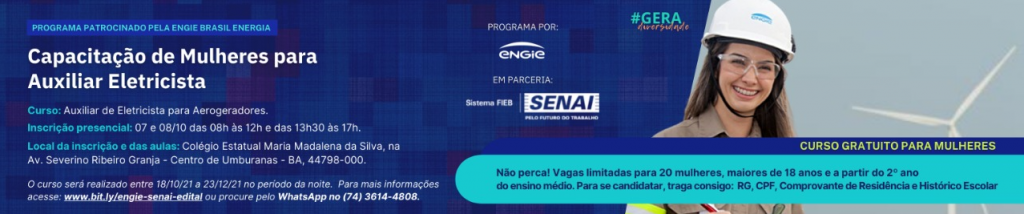 A ENGIE BRASIL ENERGIA S.A e o Serviço Nacional de Aprendizagem Industrial – SENAI/DR/BA, faz saber aos interessados que estarão abertas as inscrições para o Programa de Qualificação Profissional Auxiliar Eletricista para Aerogeradores + #geradiversidade, com vistas à seleção de candidatas para curso gratuito na área de Elétrica no município de Umburanas (BA), consoante as condições contidas neste Processo Seletivo.
