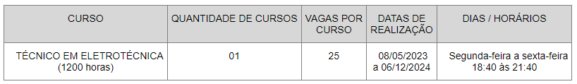 O presente processo seletivo destina-se ao preenchimento do total de 25 (vinte e cinco) vagas, no curso Técnico de nível médio em Eletrotécnica, na modalidade presencial, no município de Umburanas (BA).